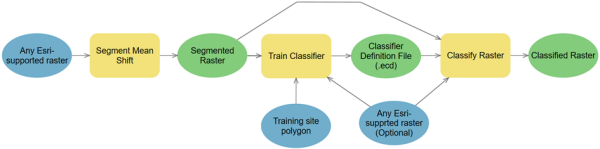 Die objektorientierte Feature-Extraktion wird von Werkzeugen unterstützt, die drei Funktionsbereiche abdecken: Bildsegmentierung, Ableitung von Analysedaten zu den Segmenten und Klassifizierung. Die ausgegebenen Daten eines Werkzeugs dienen als Eingabe für die nachfolgenden Werkzeuge, wobei das Ziel darin besteht, eine sinnvolle objektorientierte Feature-Class-Karte zu erstellen. Der objektorientierte Prozess ähnelt dem herkömmlichen pixelbasierten Bildklassifizierungsprozess, bei dem geordnete und ungeordnete Klassifizierungstechniken zum Einsatz kommen. Statt Pixeln werden in diesem Prozess Segmente – die man sich als Superpixel vorstellen kann – klassifiziert. Jedes Segment (oder Superpixel) liegt in Form eines Satzes von Attributen vor, anhand dessen die Klassifizierungswerkzeuge das klassifizierte Bild erstellen.