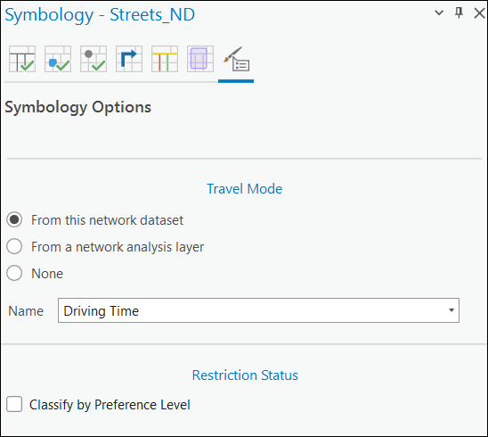 allows you to show network symbology by a travel mode and the restriction status preference level.
