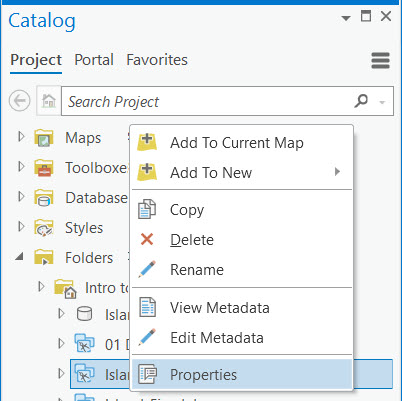 You can display the CAD file properties by selecting the Properties option from the context menu for a file item in the Catalog pane. Multiple options display the various property categories.