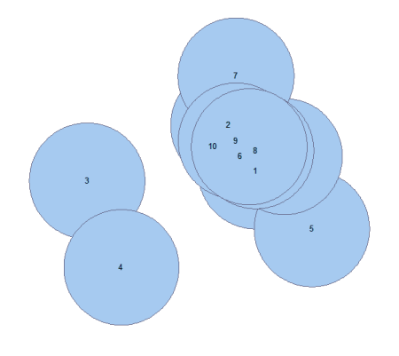For example, two feature layers are illustrated below. One contains 10 features—buffers around points, and the other contains one feature—a square.