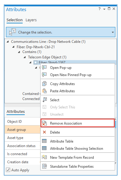 To remove a network feature or object from an association, expand the tree view and right-click the feature or object below the association type and click Remove Association