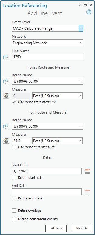 - Haga clic en la pestaña Location Referencing y, en el grupo Eventos, haga clic en Agregar > Evento de línea