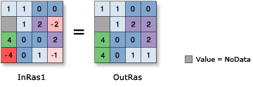 | Etiqueta | Explicación | Tipo de datos | Ráster de salida | El ráster de salida. Los valores de celda son el valor absoluto de las celdas del ráster de entrada. | Raster |