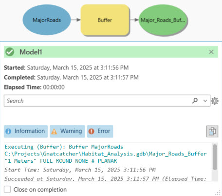 Una vez que haya creado un modelo y comprobado que todos los procesos son válidos, el modelo estará listo para ejecutarse. Puede ejecutar un modelo paso a paso o completamente en ModelBuilder, o bien como herramienta de geoprocesamiento desde el panel Geoprocesamiento.