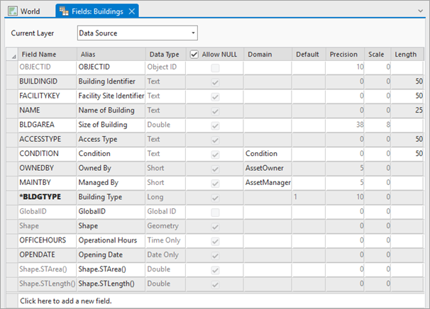 Cada una de estas capas contiene diversos campos que describen las propiedades o atributos de esa capa. Por ejemplo, la capa Buildings representa un conjunto de edificios del campus y tiene campos que describen cada una de las propiedades del edificio, como su nombre, el tipo de edificio del que se trata, el tamaño del edificio, etc. Toda esta información se almacena como campos de una tabla, los componentes más fundamentales.