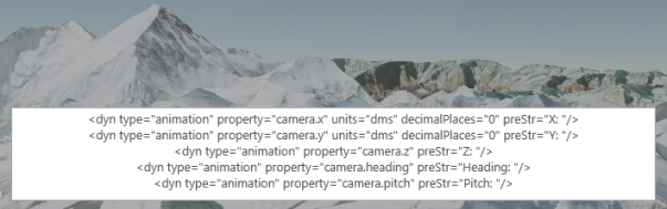 <dyn type="animation" property="camera.x" units="dms" decimalPlaces="0" preStr="X: "/> <dyn type="animation" property="camera.y" units="dms" decimalPlaces="0" preStr="Y: "/> <dyn type="animation" property="camera.z" preStr="Z: "/> <dyn type="animation" property="camera.heading" preStr="Heading: "/> <dyn type="animation" property="camera.pitch" preStr="Pitch: "/> |