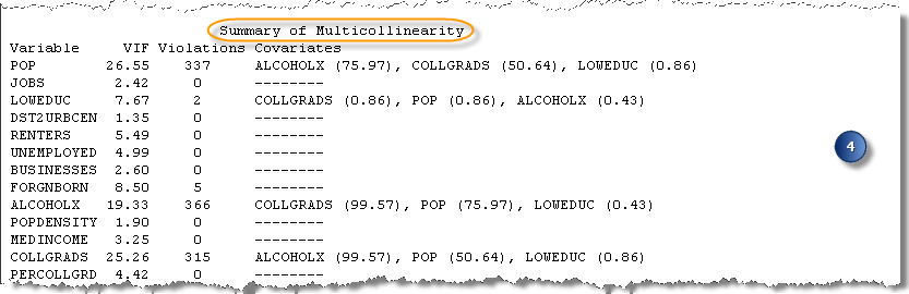 Puede utilizar la sección Resumen de multicolinealidad del informe junto con la sección Resumen de significancia de la variable para comprender qué variables explicativas candidatas se pueden eliminar del análisis para mejorar el rendimiento. La sección Resumen de multicolinealidad indica cuántas veces se incluyó cada variable explicativa en modelos con alta multicolinealidad, y el resto de variables explicativas que también se incluyeron en dichos modelos. Cuando dos (o más) variables explicativas suelen estar juntas con frecuencia en modelos con alta multicolinealidad, quiere decir que esas variables pueden estar proporcionando los mismos resultados. Puesto que solo desea incluir variables que expliquen un aspecto único de la variable dependiente, plantéese elegir solo una de las variables redundantes para incluirla en análisis posteriores. Un método es utilizar la variable de redundancia más potente en base a los resultados de Resumen de significancia de la variable.