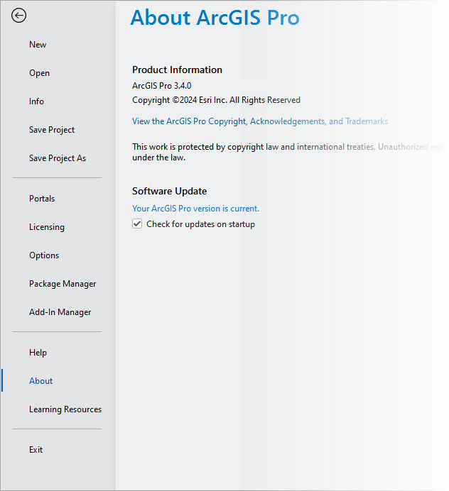 About (À propos) | Afficher des informations sur votre version de ArcGIS Pro et effectuer lamise à jour vers la nouvelle version. |