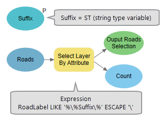 La substitution de variables de modèle peut aider à transmettre les valeurs saisies par un utilisateur directement dans un outil dans votre modèle. Par exemple, dans le modèle illustré ci-après, Suffix (Suffixe) est un paramètre de modèle spécifié lorsque l’outil de modèle est exécuté à partir de la fenêtre Geoprocessing (Géotraitement). Cette variable est utilisée dans le paramètre Expression de l’outil Sélectionner une couche par attributs en tant que RoadLabel LIKE '%\%Suffix\%' ESCAPE '\'. Lorsque l’outil s’exécute, l’expression fonctionne de la même manière que RoadLabel LIKE '%ST' où la variable en ligne Suffix (Suffixe) est remplacée par la valeur ST, et seules les routes dont l’étiquette se termine par ST sont sélectionnées.