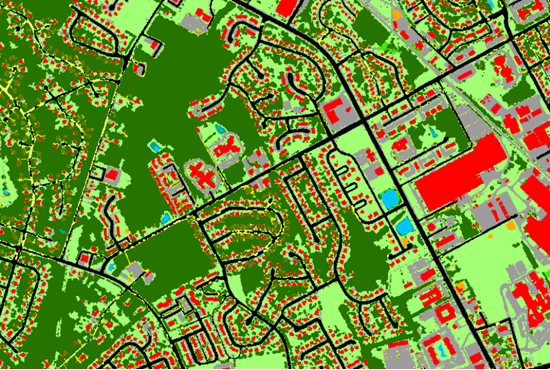 Utilisez l’outil Classer des pixels à l’aide du Deep Learning pour classer des pixels d’imagerie. Cet outil exécute un modèle de Deep Learning entraîné sur un raster en entrée afin de générer un raster classé, une étiquette de classe étant attribuée à chaque pixel. Par exemple, la classification de pixels peut être utilisée pour la classification d’occupation du sol. L’image ci-dessous présente un exemple de classification d’occupation du sol.