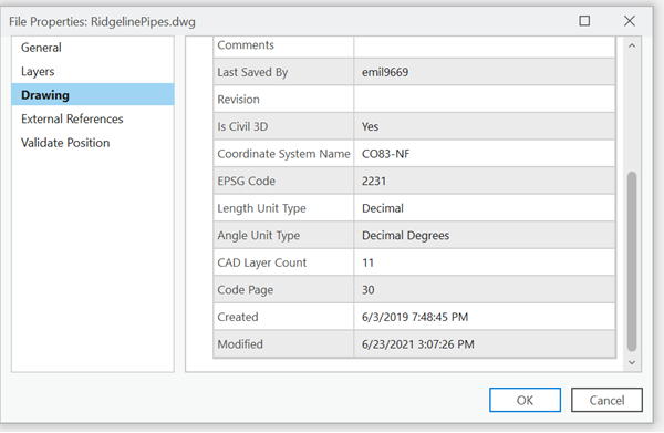 L’onglet Drawing (Dessin) contient des paramètres issus d’un fichier DWG ou DXF et peut vous renseigner sur la version du fichier, sa date de création, son auteur et le dernier éditeur. La propriété des unités linéaires est utile pour sélectionner la bonne référence spatiale d’un fichier DAO. Pour la mise à l’échelle conforme des données, les unités linéaires du dessin et de la référence spatiale doivent correspondre. Les informations de nom du système de coordonnées Autodesk dans les dessins AutoCAD peuvent vous aider à sélectionner un système de coordonnées Esri approprié.