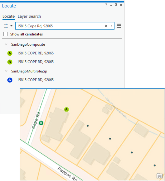 Prenons l’exemple d’un localisateur composite nommé SanDiegoComposite, comprenant deux localisateurs individuels basés sur les rôles Point Address (Adresse du point) et Street Address (Adresse), créé avec les données ci-dessus. Un localisateur à rôles multiples nommé SanDiegoMultiroleZip et basé sur les rôles Point Address (Adresse du point) et Street Address (Adresse) est créé pour les deux rôles. Le résultat de la recherche de 15815 Cope Rd, 92065 dans la fenêtre Locate (Localiser) est illustré ci-dessous.
