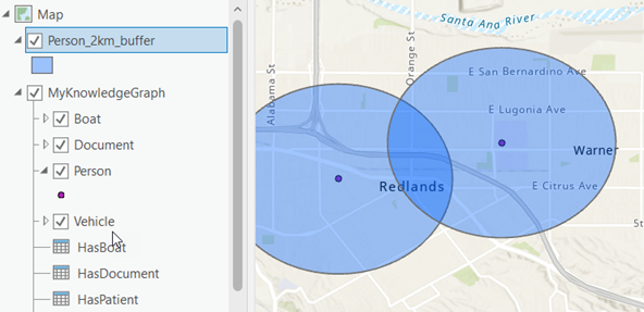 Une fois qu’un graphe de connaissances a été ajouté à une carte, les entités auxquelles sont associées des entités spatiales peuvent être analysées d’un point de vue géographique à l’aide d’opérations de géotraitement. Par exemple, vous pouvez utiliser l’outil de géotraitement Zone tampon deux par deux pour déterminer autour d’une entité d’intérêt une zone spatiale dans laquelle rechercher d’autres entités.