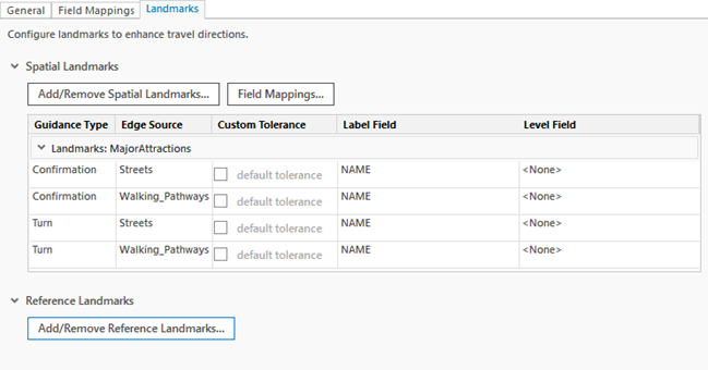 Il y a deux groupes : Spatial Landmarks (Points de repère spatiaux) et Reference Landmarks (Points de repère de référence). Les points de repère spatiaux sont des classes d’entités, et les points de repère de référence sont des tables. Les points de repère spatiaux reposent sur une recherche spatiale réalisée en même temps que le calcul visant à déterminer si un point de repère doit être référencé. Les points de repère de référence ont leur propre localisation sur le réseau créé dans la ligne, de sorte que seule une recherche dans la table est nécessaire pour utiliser le point de repère dans une feuille de route. Une recherche spatiale est plus lente qu’une recherche normale dans la table, si bien que les points de repère de référence s’exécutent plus rapidement que les points de repère spatiaux.