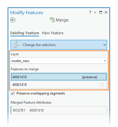 Les entités sélectionnées apparaissent dans la section Features to merge (Entités à combiner) et leurs couches d’origine dans la liste déroulante Layer (Couche).