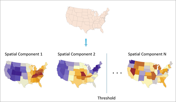 Décompose une classe d’entités et un voisinage dans un jeu de composantes spatiales. Les composantes représentent des modèles spatiaux potentiels des entités, tels que des agrégats ou des tendances.