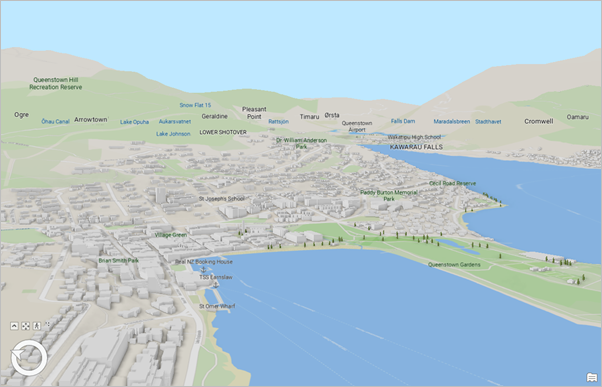 est désélectionné sur le ruban, et la superposition est supprimée de la scène. - Appuyez trois fois sur la touche Tab pour sélectionner la zone d’échelle de la carte. Appuyez sur la touche Suppr pour supprimer la valeur actuelle. Saisissez 10 000 et appuyez sur la touche Entrée pour réaliser un zoom avant sur la station touristique sportive de Queenstown.