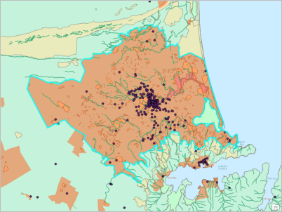お使いのシンボルの色とは異なります。 - マップをズーム アウトして、すべてのレイヤーがクライストチャーチ市街地の範囲にクリップされていることを確認します。