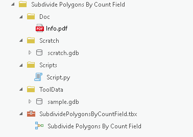 ツールで使用するすべてのリソースをまとめるのに推奨されるフォルダー構造は以下のとおりです。 リソースをまとめたら、このフォルダーを *.zip ファイルに圧縮してジオプロセシング サンプルを作成します。