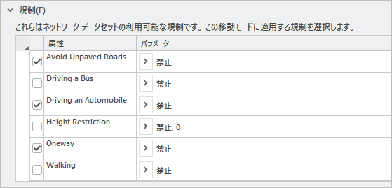 これ以外にも、PAVED、AR_PEDEST、AR_BUS、AR_AUTO、DIR_TRAVEL、TF_HeightLimit_Meters、FT_HeightLimit_Meters などのフィールドがあります。 これらのフィールドは、特定の状況で、一部の道路の通行を禁止する規制を設定する場合に使用します。 これらのフィールドのほとんどは、Y または N の値を持ちます。 DIR_TRAVEL フィールドの値 (FT や TF など) は、一方通行の規制を設定する場合に使用します。 FT_HeightLimit_Meters フィールドと TF_HeightLimit_Meters フィールドの値は、ほとんどの場合が NULL 値であり、一部のフィーチャには数字が入力されます。 これら 2 つのフィールドは、パラメーター化規制という特殊な規制を設定する場合に使用します。 高さ制限を設定すると、観光バスの車高を解析設定で指定できます。また、車高が原因で、観光バスが一部の道路を通行できない場合は、ネットワーク データセットでその道路を規制することができます。