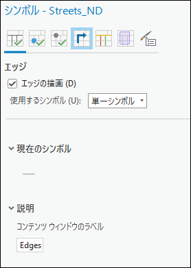デフォルトでは、カテゴリで [使用するシンボル] ドロップダウン リストから [単一シンボル] が使用されるため、[現在のシンボル] には、すべてのエッジに使用されるシンボルが 1 つしか表示されません。