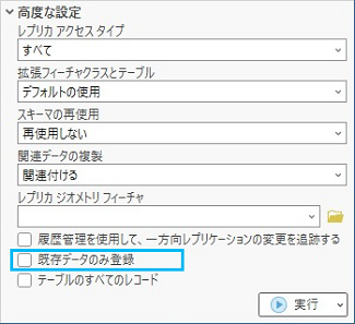 - データが子ジオデータベース内にすでに存在しており、レプリカ データセットの定義に使用されている場合は、任意で [既存データのみ登録] にチェックを入れてください。