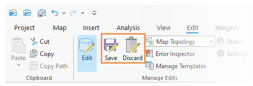 バージョン非対応のエンタープライズ ジオデータベースのワークスペースを選択すると、リボンの [編集] タブで、編集内容を手動で保存および破棄できます。
