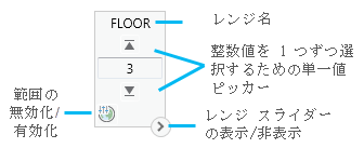 レイヤーまたはスタンドアロン テーブルのレンジを定義すると、マップまたはシーンの横に、レンジ スライダーが画面上のコントロールとして表示されます。 表示されたレンジの最小値と最大値を対話的に調整したり、レンジ全体を上下に移動したりできます。 スライダーとレンジの設定は、[レンジ] タブを使用して完全に構成可能です。これにより、論理的な増分を使用してデータの全レンジを表示できます。 レンジ スライダーは、全範囲を示すレンジ スライダーまたは単純化された単一値モードとして表示できます。 単一値モードは、特定のレンジ値のエイリアスの構成もサポートします。たとえば、Ground 値の「FloorNumber」ではなく「0」と表示したり、Tuesday 値の「DayOfWeek」の代わりに「3」と表示したりできます。