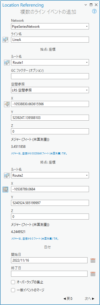 選択した方法が、始点ラベルと終点ラベルに表示されます。 たとえば、選択した始点方法が、[ルートとメジャー] で、選択した終点方法が [座標] の場合は、[始点: ルートとメジャー] および [終点: 座標] と表示されます。