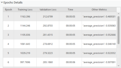 エポックの詳細 | トレーニング ロス、検証ロス、時間、その他の指標など、各エポックの情報を格納したテーブル。