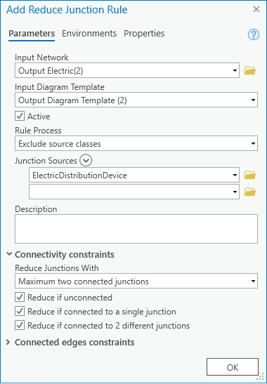 ダイアグラム テンプレート モデル ビルダーで、[属性によるダイアグラム フィーチャ機能ルールを追加 (Add Diagram Feature Capability By Attribute Rule)] ツールまたは [カテゴリによるダイアグラム フィーチャ機能の追加 (Add Diagram Feature Capability By Category)] ツールを使用すると、ダイアグラム テンプレートに構成された、ジャンクションの削除ルールのシーケンスを簡素化できます。