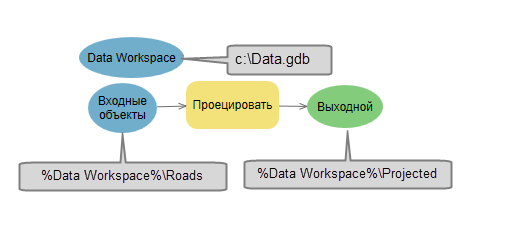 На показанной ниже модели переменная рабочей области Рабочая область данных имеет значение C:\Data.gdb. Это расположение рабочей области подставляется в качестве встроенной переменной в параметрах инструмента Проецировать путем заключения имени переменной в символы процента. Во время работы, актуальное значение переменной, C:\Data.gdb, заменяется на %Data Workspace%.