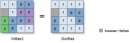 Значениями выходных ячеек будут целые числа 0 или 1, или NoData, если значение входных ячеек – NoData.