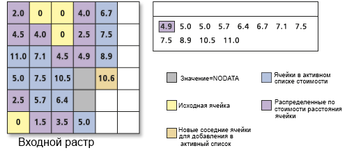 В приведенном ниже примере ячейка в строке 3, столбце 1 (выделена), имеет суммарную стоимость 11,0, если она была помещена в активный список, чтобы достигнуть источник наверху растра. Однако, поскольку нижний источник расширен до этого местоположения, ячейки имеют доступ к пути с самой дешевой суммарной стоимостью для достижения источника. Значение для местоположения было обновлено в активном списке и распределено в выходные данные из-за этой меньшей суммарной стоимости.
