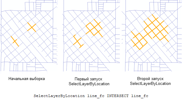 В примере ниже используется отношение Пересекает для расширения выборки из двух исходных точек. В пределах расстояния (WITHIN_A_DISTANCE в Python) также может использоваться для выбора пространственных объектов, которые находятся в пределах определенного расстояния от исходной выборки.