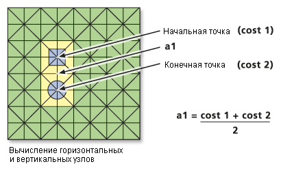 При перемещении из ячейки в одну из четырех соседних ячеек, имеющих с ячейкой общее ребро, стоимость движения по этим связям в соседний узел будет равна среднему из стоимости перемещения через ячейки 1 и 2: