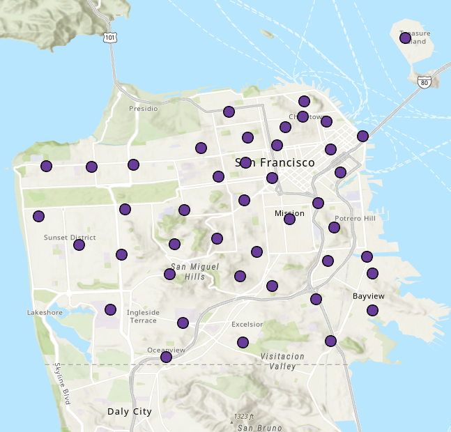Слой области обслуживания ссылается на набор сетевых данных г. Сан-Франциско, поскольку он был на карте при создании слоя и был указан в качестве источника сетевых данных карты.