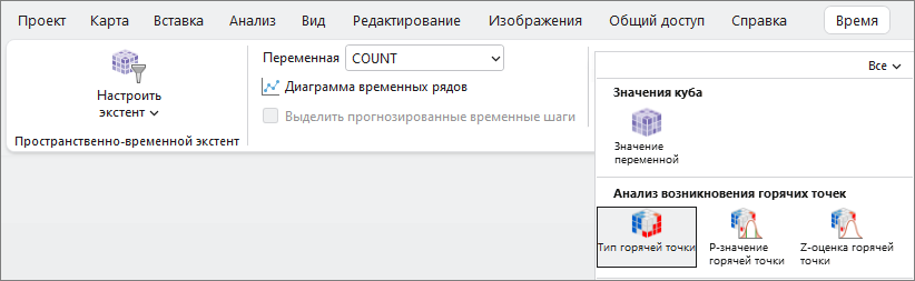 отображает бины пространство-время, обозначаемые типом горячей точки для выбранной переменной куба. Бины окрашены по их значимости как горячих точек.