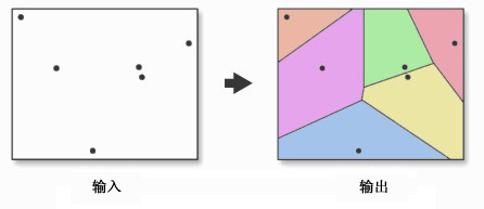 此工具用于将输入点要素覆盖的区域划分为泰森区域或邻近区域。 这些区域表示其中任何位置到其关联点的距离都比到任何其他点输入要素的距离近的全部区域。