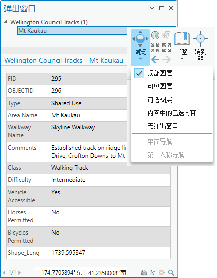 处于活动状态,然后单击要素以打开其弹出窗口。 单击浏览工具上的下拉箭头,以识别不同图层中的要素。