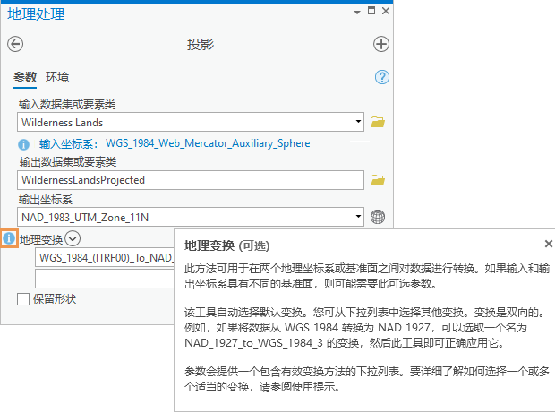 打开的地理处理工具上的所有参数和环境设置都具有帮助信息。 要访问该帮助信息,可将光标悬停在每个设置的标注旁的信息图标