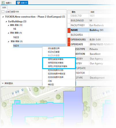 在解决冲突时,需要确定要保留的要素和属性的表示。 协调操作后,可以使用“冲突”视图指定要保留的表示。 请记住,在“冲突”视图中使用替换选项与执行编辑操作相同。