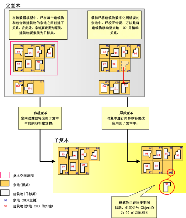 - 上图显示的是宗地和建筑物之间存在简单关系类的情况,其中宗地要素类的 ObjectID 字段为源主键。 在本例中,仅为一定空间范围内的宗地和建筑物创建了复本。 然而,在创建完复本后检测出一个数字化错误,即发现某个建筑物被数字化到错误的宗地中。 校正的方法是在父复本地理数据库中移动建筑物并编辑关系使其与正确的宗地相关。 然后,对复本进行同步以将更改应用到子复本中。 在这种情况下,建筑物会被移动,但在子复本中它仍与错误的宗地相关。 子复本中的关系未发生更改,因为子复本地理数据库中不存在正确的源行(父复本中 ObjectID 为 102 的宗地)。 在此类情况下,关系不会改变。