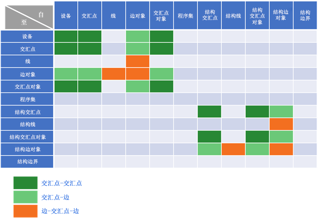且会在通过中间交汇点连接的两个边之间建立边-交汇点-边连通性。 上方的深橙色单元格支持要素之间的边-交汇点-边连通性。 下表列出了所有受支持的关系,包括将通过其建立连通性的类。