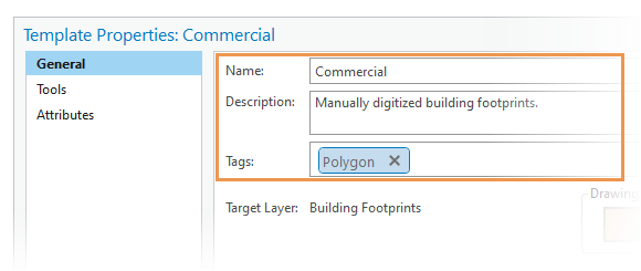 您可以为同一图层创建多个编辑模板,然后使用不同的属性值和工具设置对其进行配置。 所有模板都包含一个常规侧选项卡,您可以在其中指定名称和可选的描述性元数据;还包括一个工具侧选项卡,您可以在其中配置工具选项板上显示的工具。